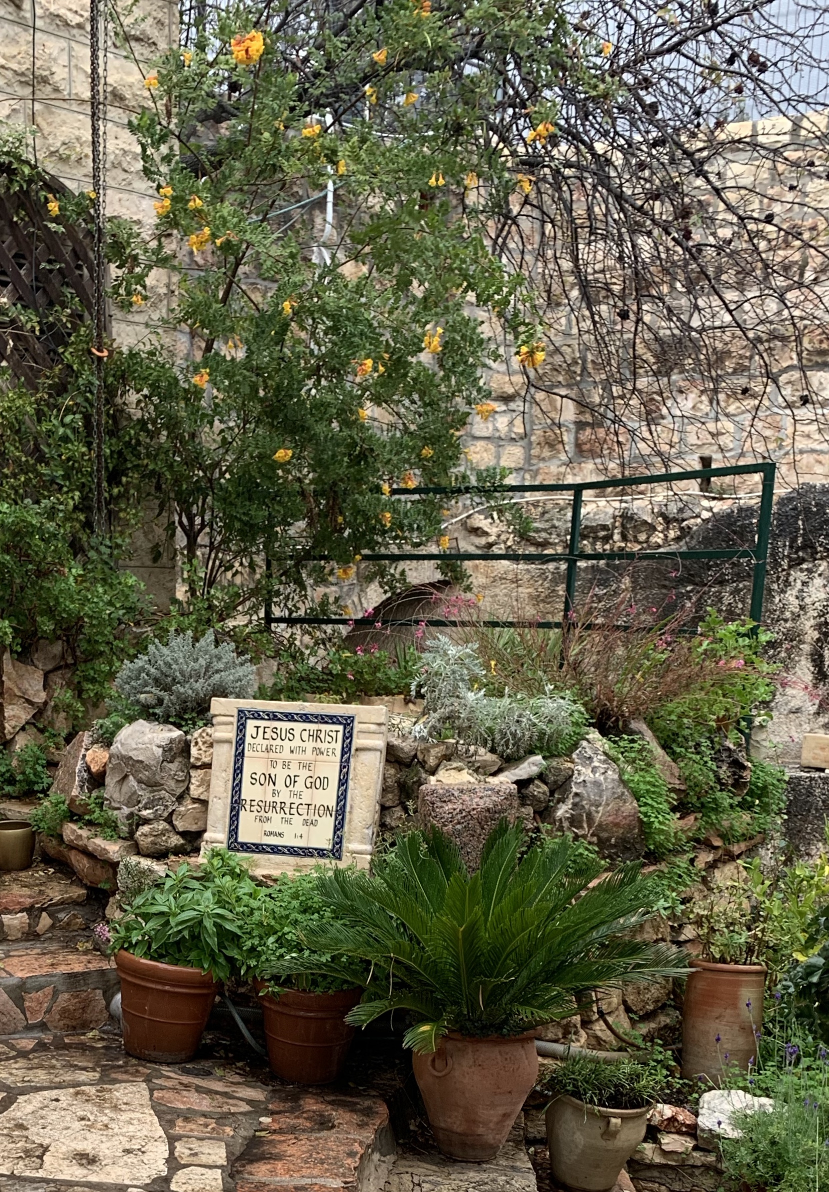 The pathways at the Garden Tomb were embelished with decorative stone plaques and potted plants