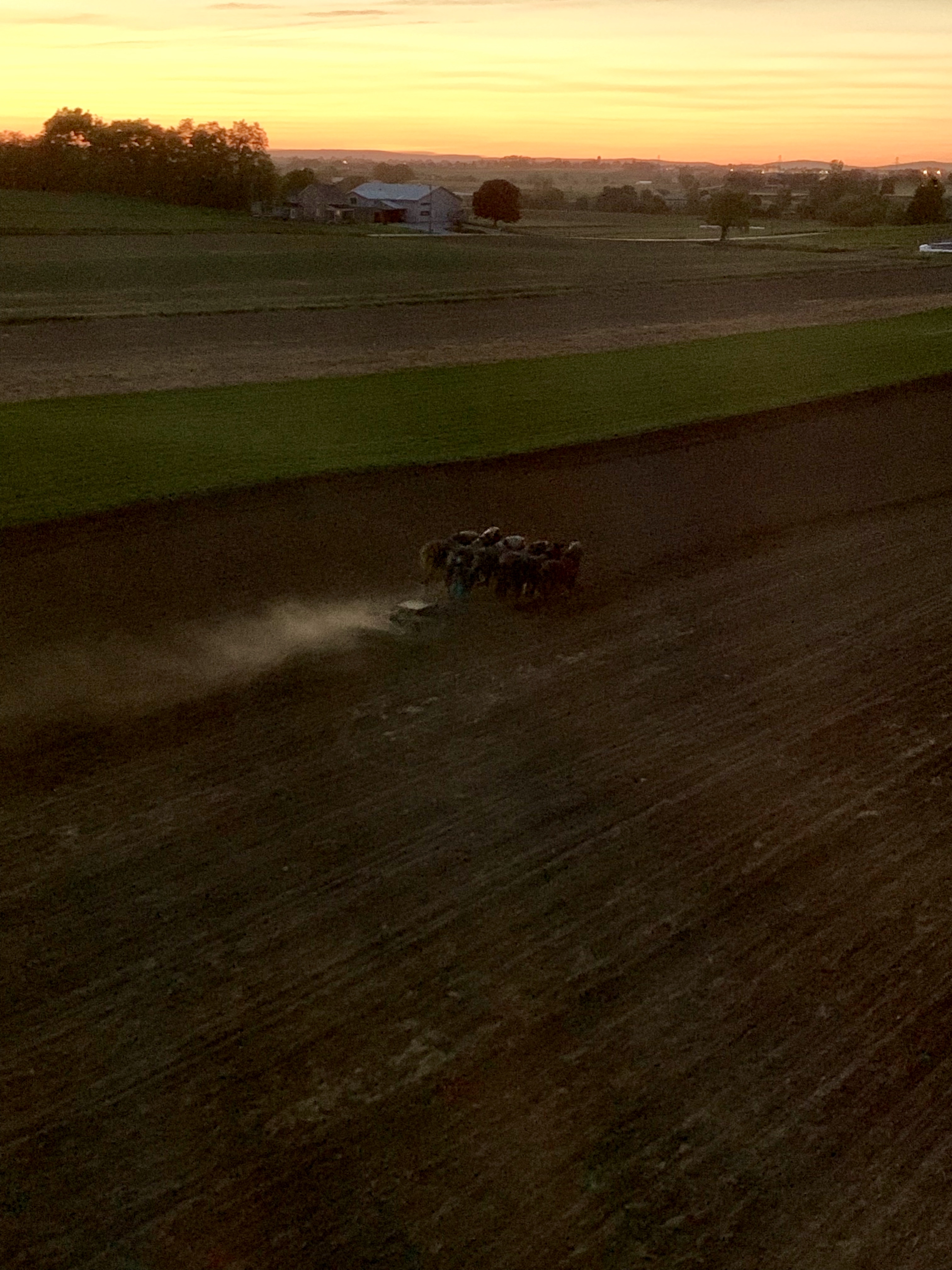 The Amish woman started working in the field behind our hotel at sunset and continued past dark.