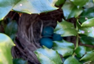 A robin’s nest with three blue eggs in our bush. A couple of years ago we had a cardinal’s nest.