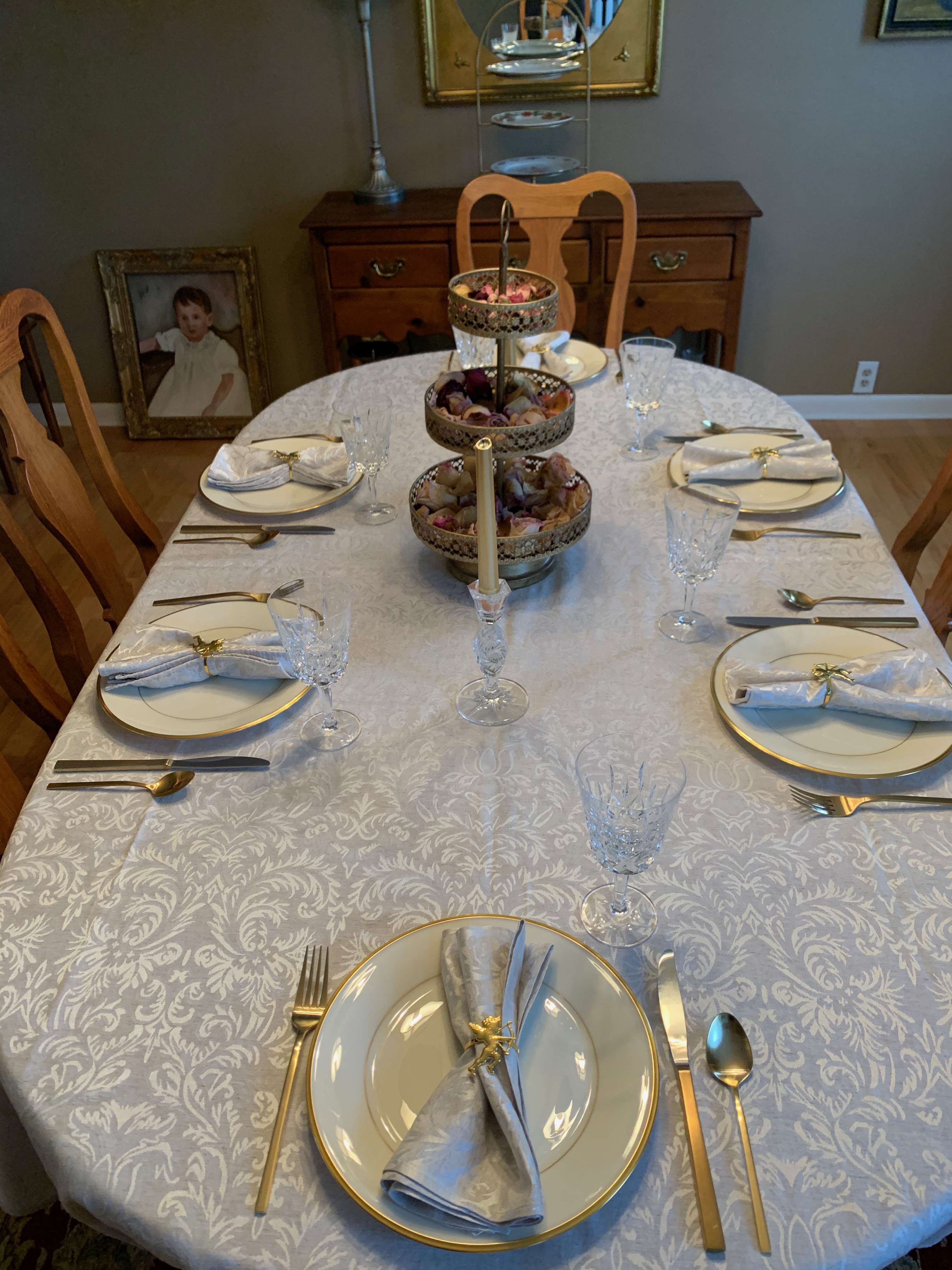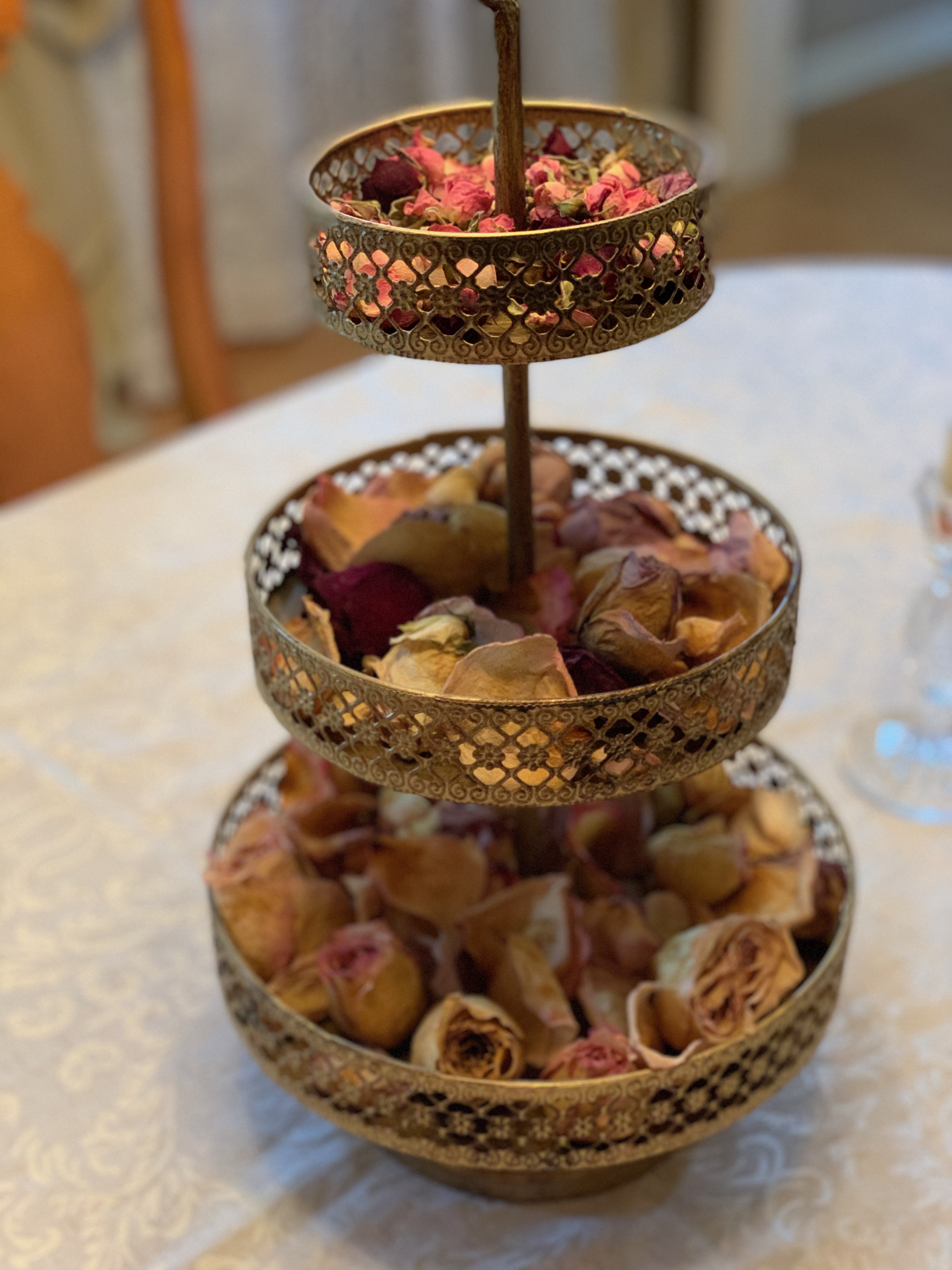 As I was poking around my closets, looking for a suitable table decoration, I found the rose buds and petals I had saved. They were the perfect solution. I displayed them on the stand in the middle of the table. The muted colors make for a beautiful, serene setting.