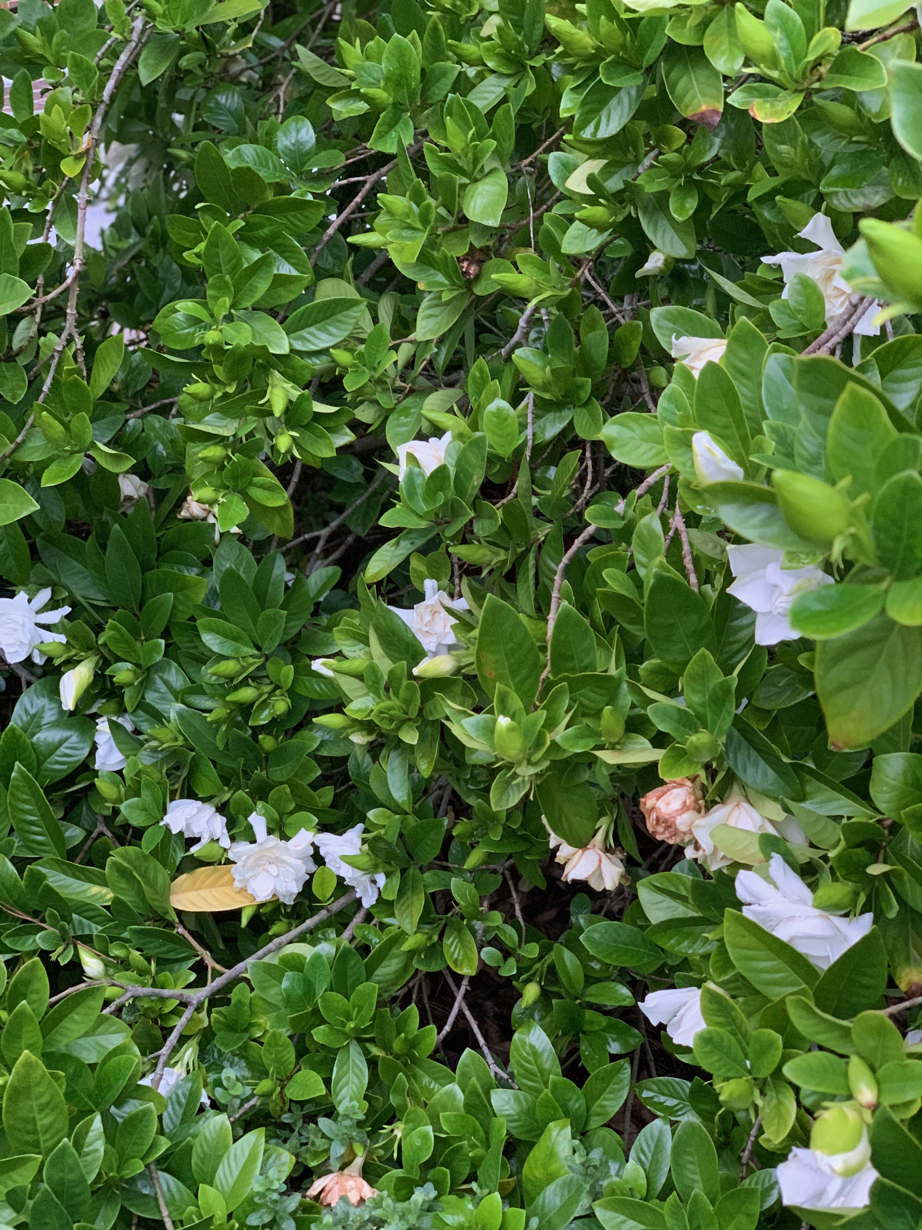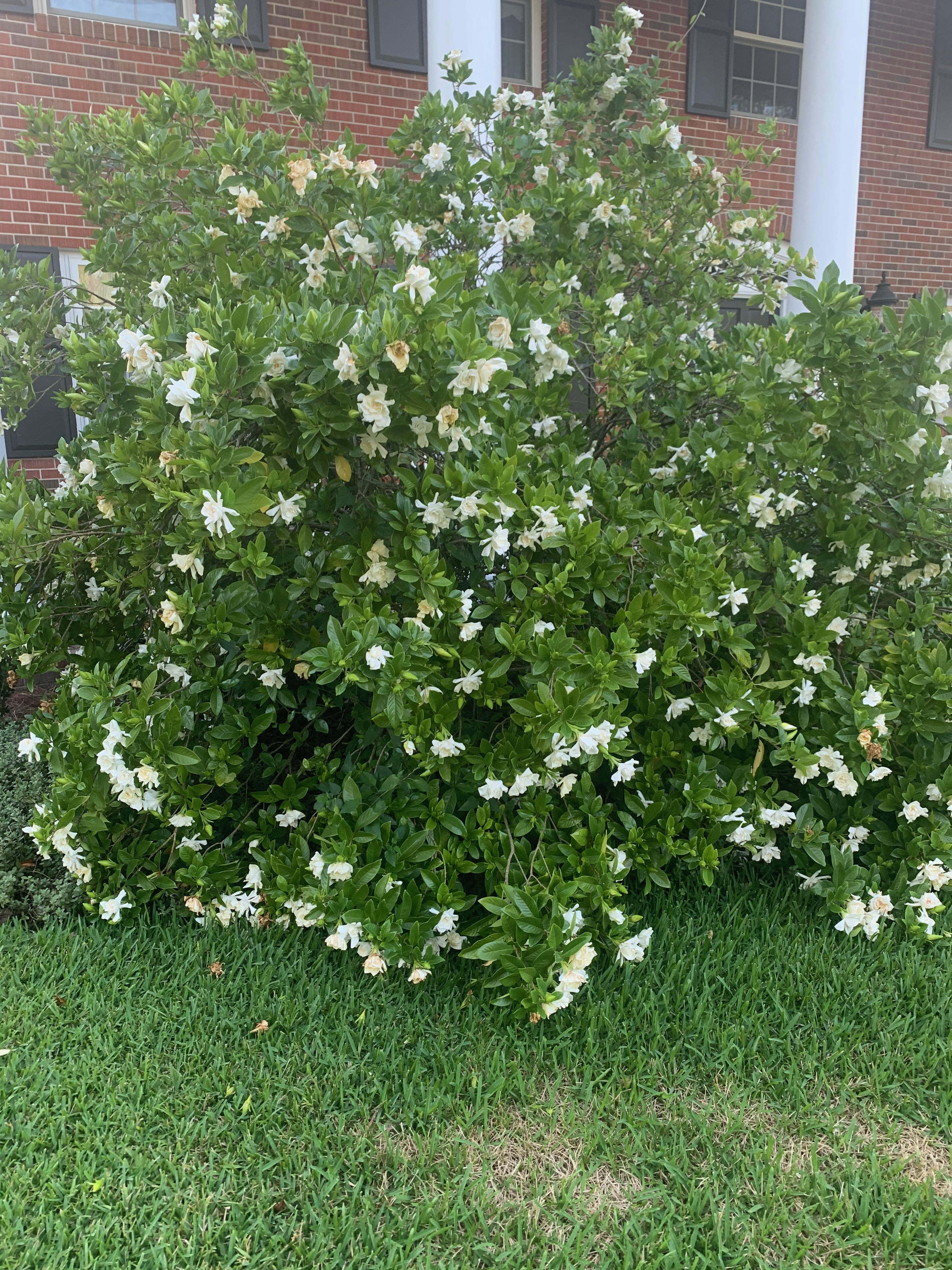 We have an enormous gardenia bush in the front of our house, a slightly smaller one by the driveway and three or four small bushes scattered around the yard. The bush in the front is quite unruly. Our house is two-story and it is close to reaching the second story. It needs to be pruned but I’m not sure how to do it and part of me can’t bear to trim one branch that might bear a fragrant gardenia bloom.