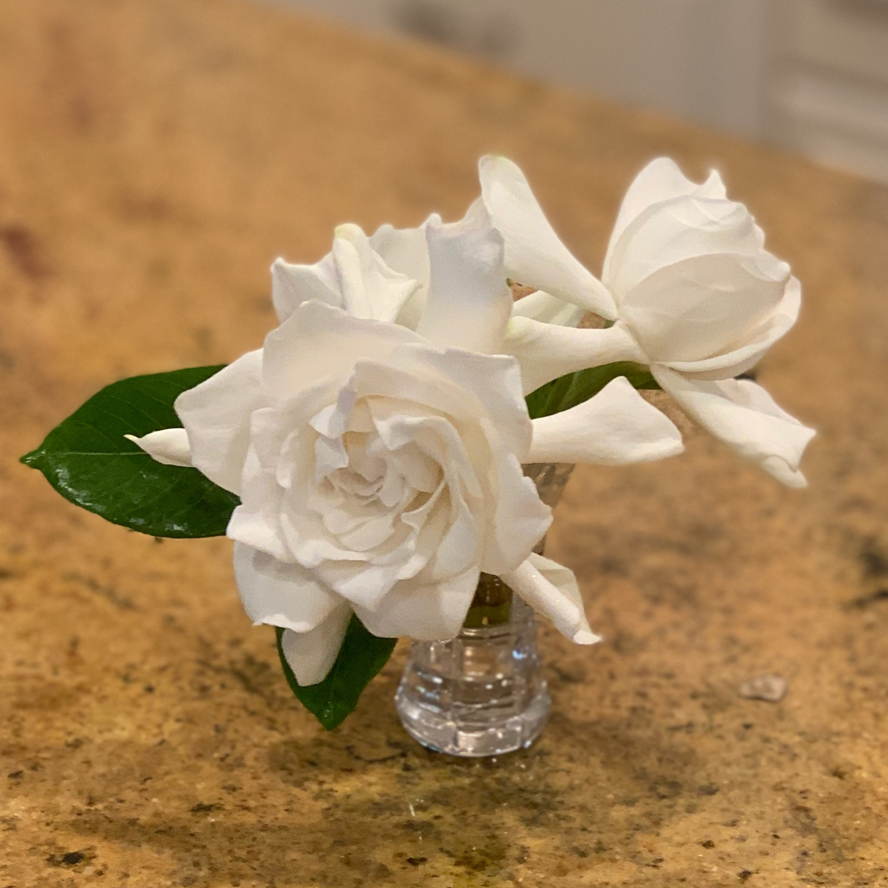 One day when I’m out with my dog, I notice a single white blossom. They’re here. It’s time for the gardenias. I walk over to the bush, put my nose in the flower and breathe deep. There is nothing quite like the smell of a gardenia.