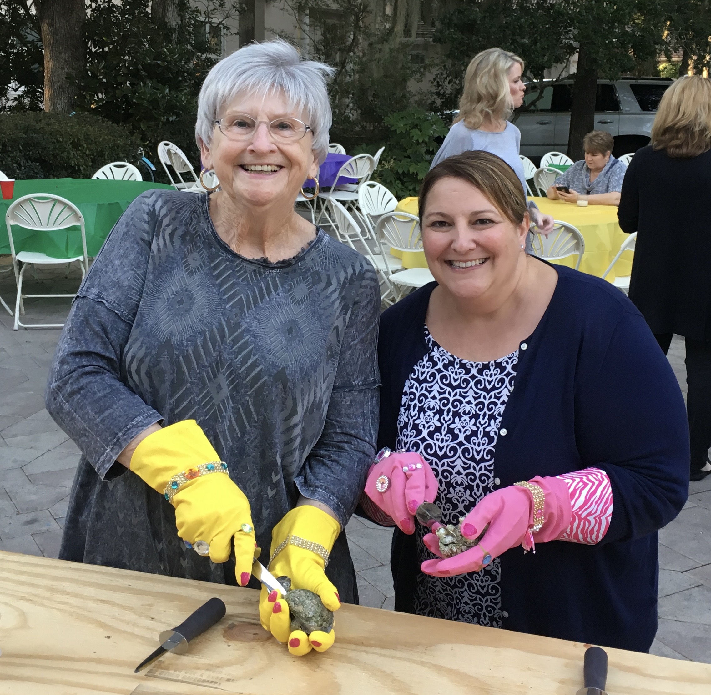 My cousin’s house was the gathering spot for the Oyster Roast for nearly thirty years and it was a marvelous place to gather. It was a ranch-style brick house on a huge corner lot with a covered carport where guests brought platters and bowls laden with delicious food to accompany the oysters. The driveway was lined with sawhorse and plywood tables supplied with oyster shuckers, paper towels, crackers and cocktail sauce. In the backyard, men stood around a large iron cooker. Washed oysters were shoveled on top of the smooth cooktop and covered with a wet burlap sack until they popped open. There was always a sense of excitement when that first shovel load of roasted oysters was spread out on the sawhorse tables. It was like a group of seagulls diving in on some tasty treat.
