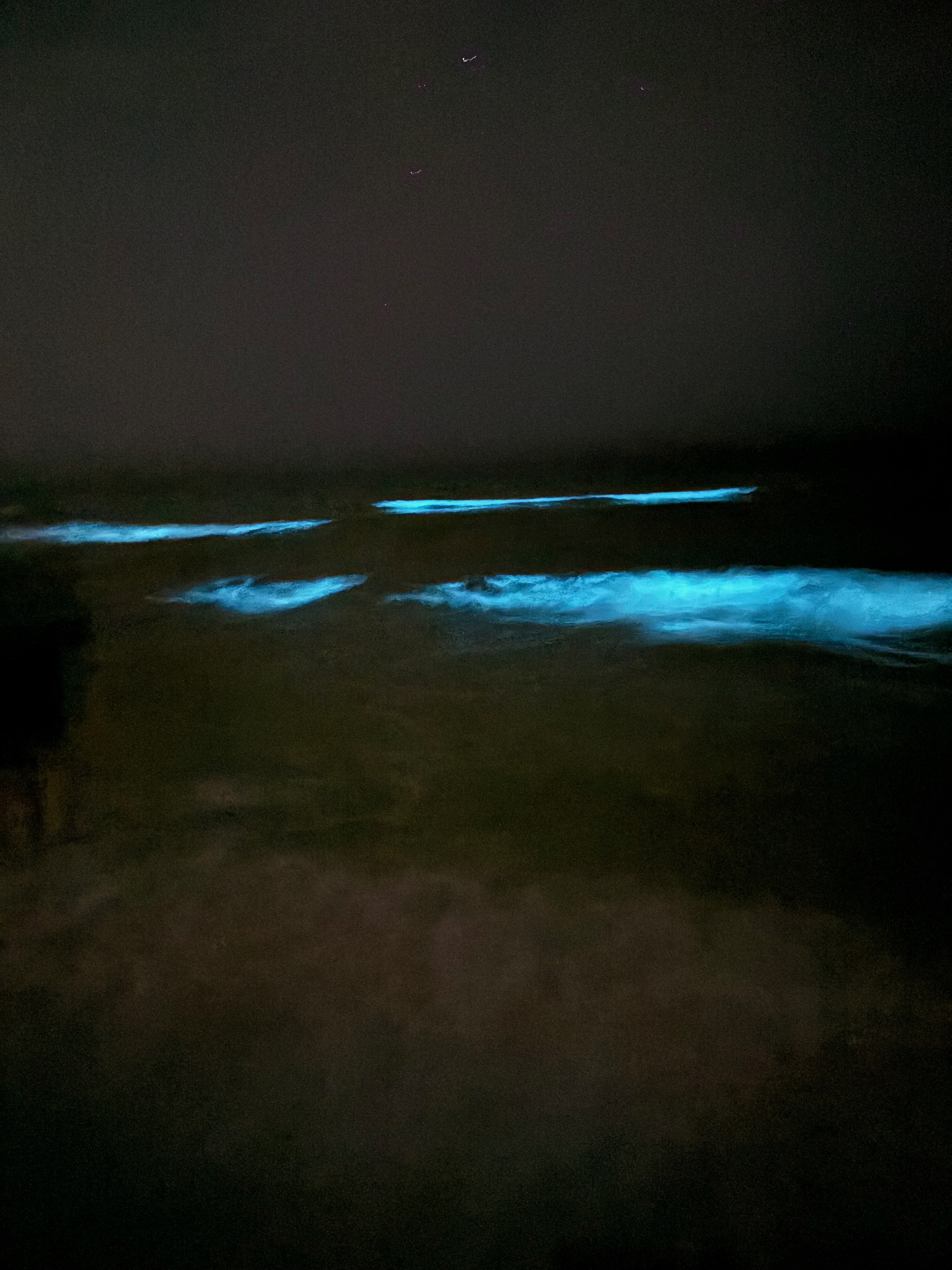 I rushed back inside the house and encouraged my family to come look. My daughter, son-in-law and I all ventured down to the shore for a closer look. It was amazing! Wherever the waves broke, you saw a line of fluorescent blue to green. It was mesmerizing. Because it was a slower time of the year, there were no other people on the beach. It was as if we were the only ones experiencing this magical moment.