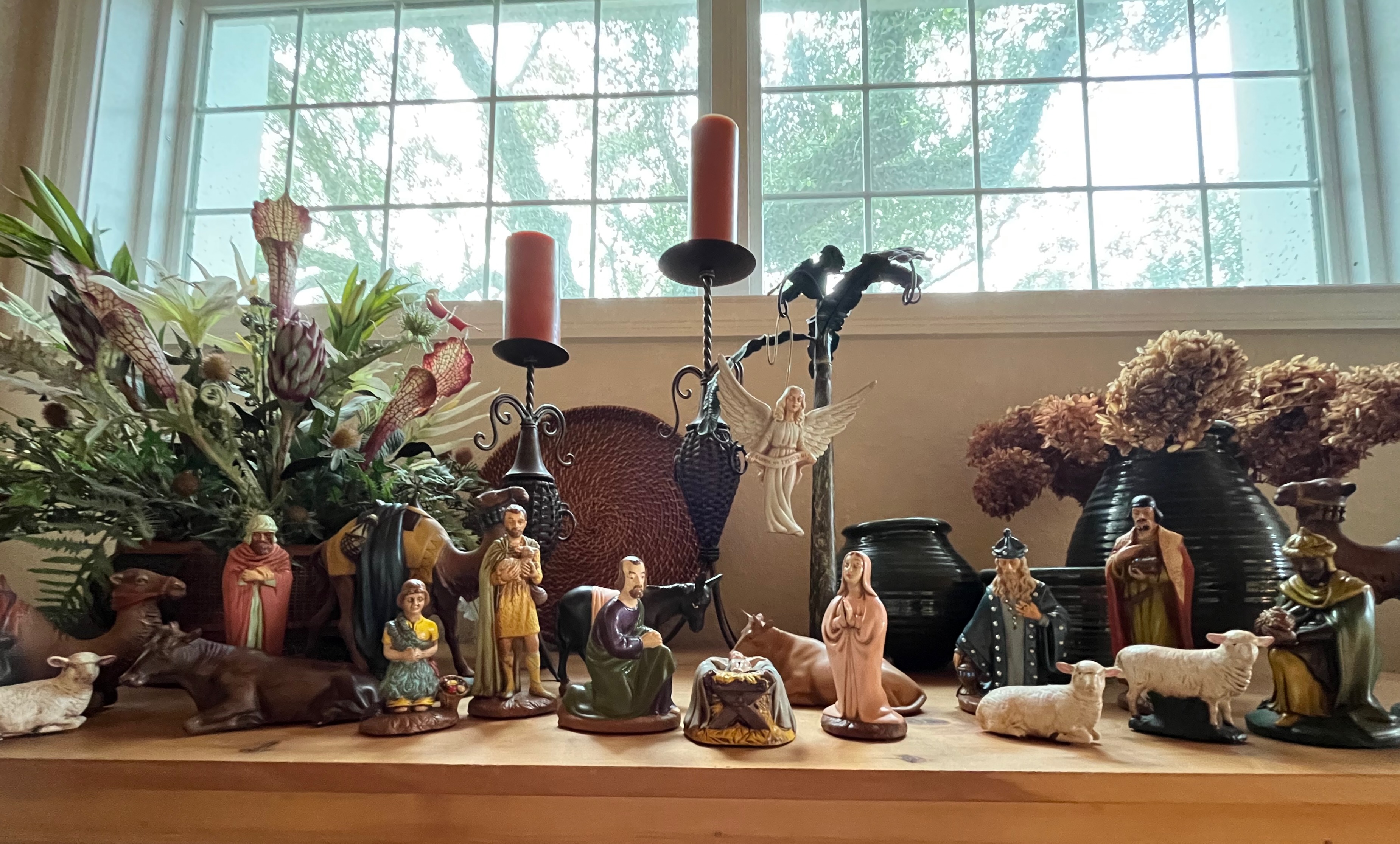 I inherited some of my mom’s Christmas decorations—a painting of Santa with a long list of names including everyone in our family, the frame for our annual crazy Christmas photo, and, best of all, her Nativity set, made by my great-aunt Lily. It’s the ceramic set that was so popular in the 1970s. I had the same set painted in blues and whites like the Lladro figurines that used to be popular, but I liked my mom’s set better. Aunt Lily painted it realistically, and the wise men had jewels glued on their clothes and gifts. (I know. The wise men were not there at the birth of Jesus, but for the sake of decoration, it works).